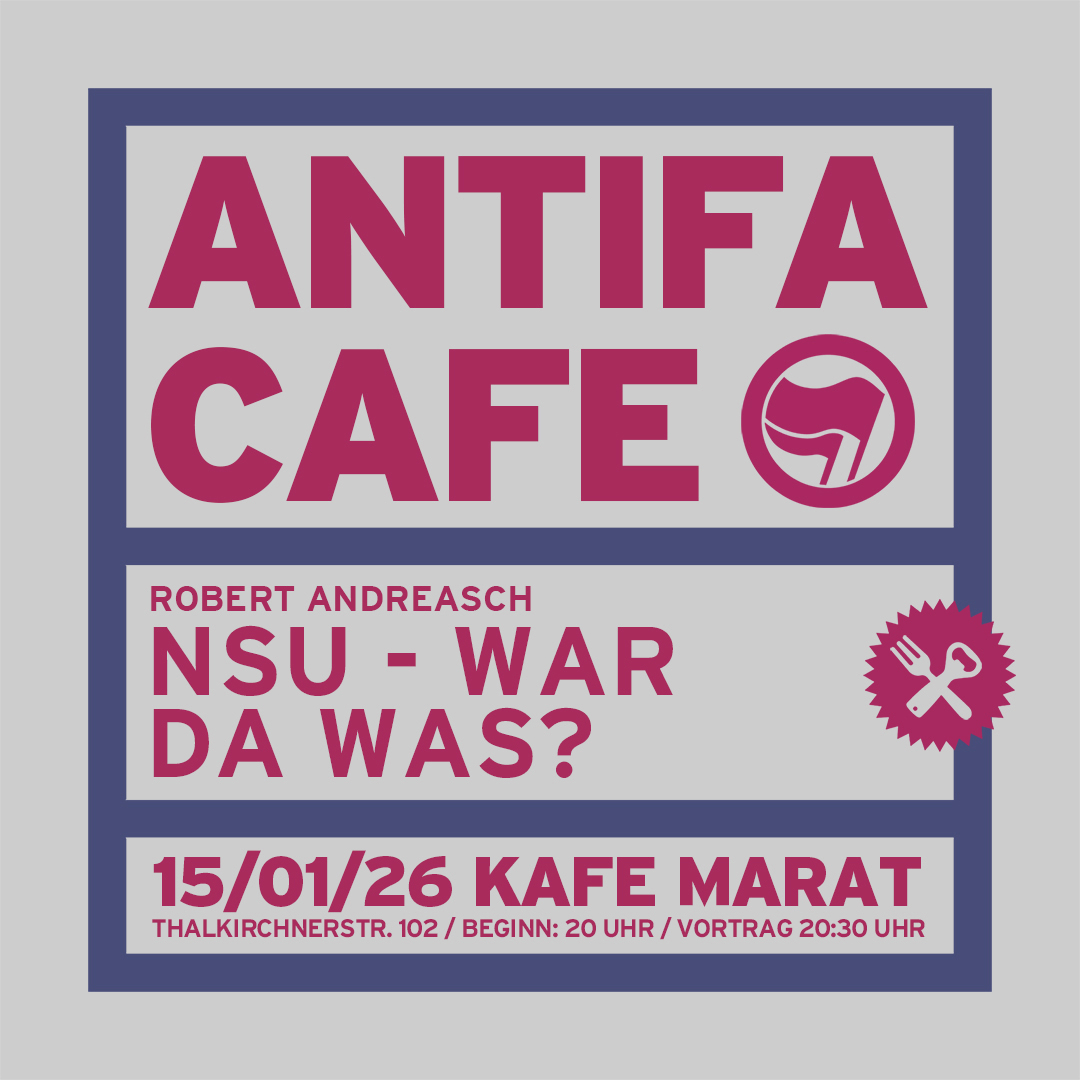 Sieben Jahre sind seit der mündlichen Urteilsverkündung im ersten NSU-Prozess vor dem Münchner Oberlandesgericht gegen damals fünf Angeklagte vergangen. Robert Andreasch erzählt im Antifa Café vom Prozess in Dresden, aber auch von Aufklärung und Nichtaufklärung in der letzten Zeit – z. B. dem Verlauf des zweiten NSU-Untersuchungsausschuss des bayerischen Landtags (2022 – 2023). Für diejenigen, die sich bisher nur wenig mit dem NSU-Komplex beschäftigt haben, wird es zunächst eine Einführung ins Thema geben!