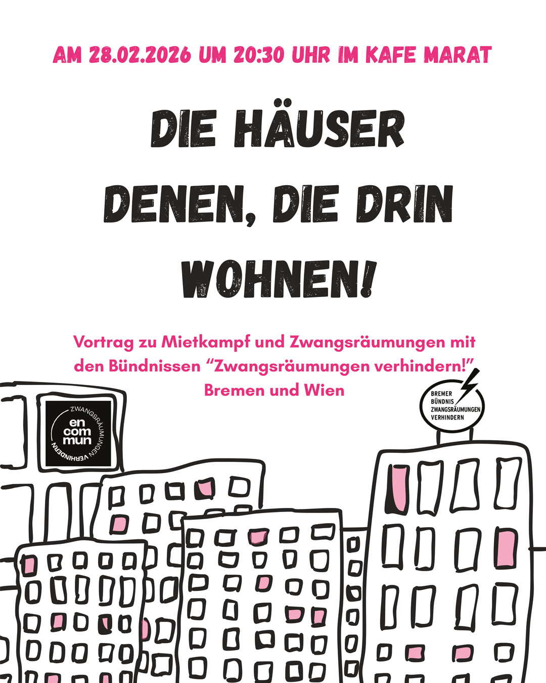 Gäste sind das Bündnis „Zwangsräumungen verhindern“ aus Bremen und Wien. Wir freuen uns auf ihre Analysen und Perspektiven und ob/wie sie auf unsere Stadt übertragbar sind – und sind auch gespannt auf eure Ideen, wie wir gegen Vermieter*innen und diese scheiß Verhältnisse Widerstand leisten können!