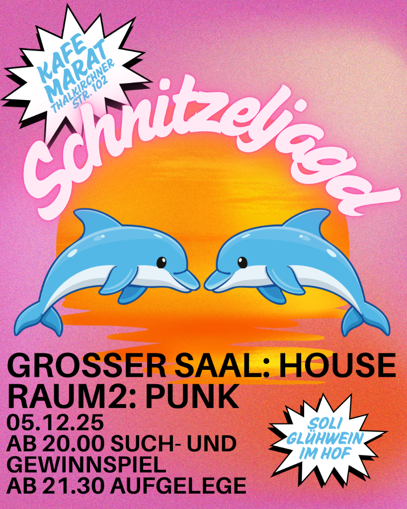 Am 5.12. erwarten euch Schnitzeljagd-Spielespaß, House-Bässe und Punk im Kafe Marat. 20.30 gehts los mit Such-und Gewinnspiel, juhu! Danach gibts im großen Saal was von Timehash, Imsie Catcher, T und Lutema auf die Ohren während sich Raum2 ins Punkstüberl verwandelt. Offen ab 20 Uhr