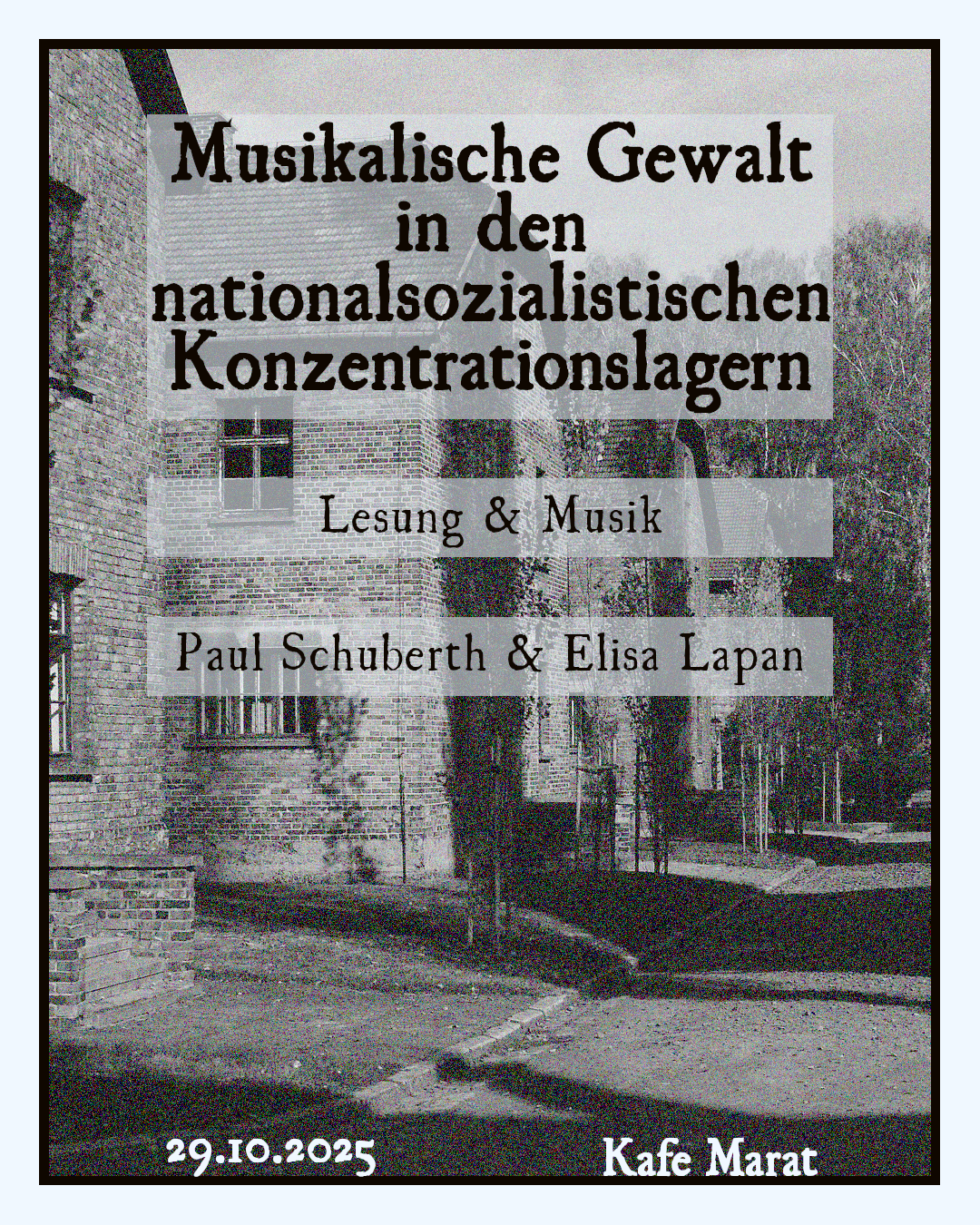 Lesung und Musik: »Musikalische Gewalt in den nationalsozialistischen Konzentrationslagern« mit Paul Schuberth und Elisa Lapan. »Dieser Vortrag (mit Musik) widmet sich einer nach wie vor wenig beleuchteten Facette der NS-Geschichte. Zwar ist vielen die Funktion des Kulturlebens im Lager Theresienstadt oder die Geschichte des Liedes „Die Moorsoldaten“ bekannt. Anders verhält es sich jedoch mit …