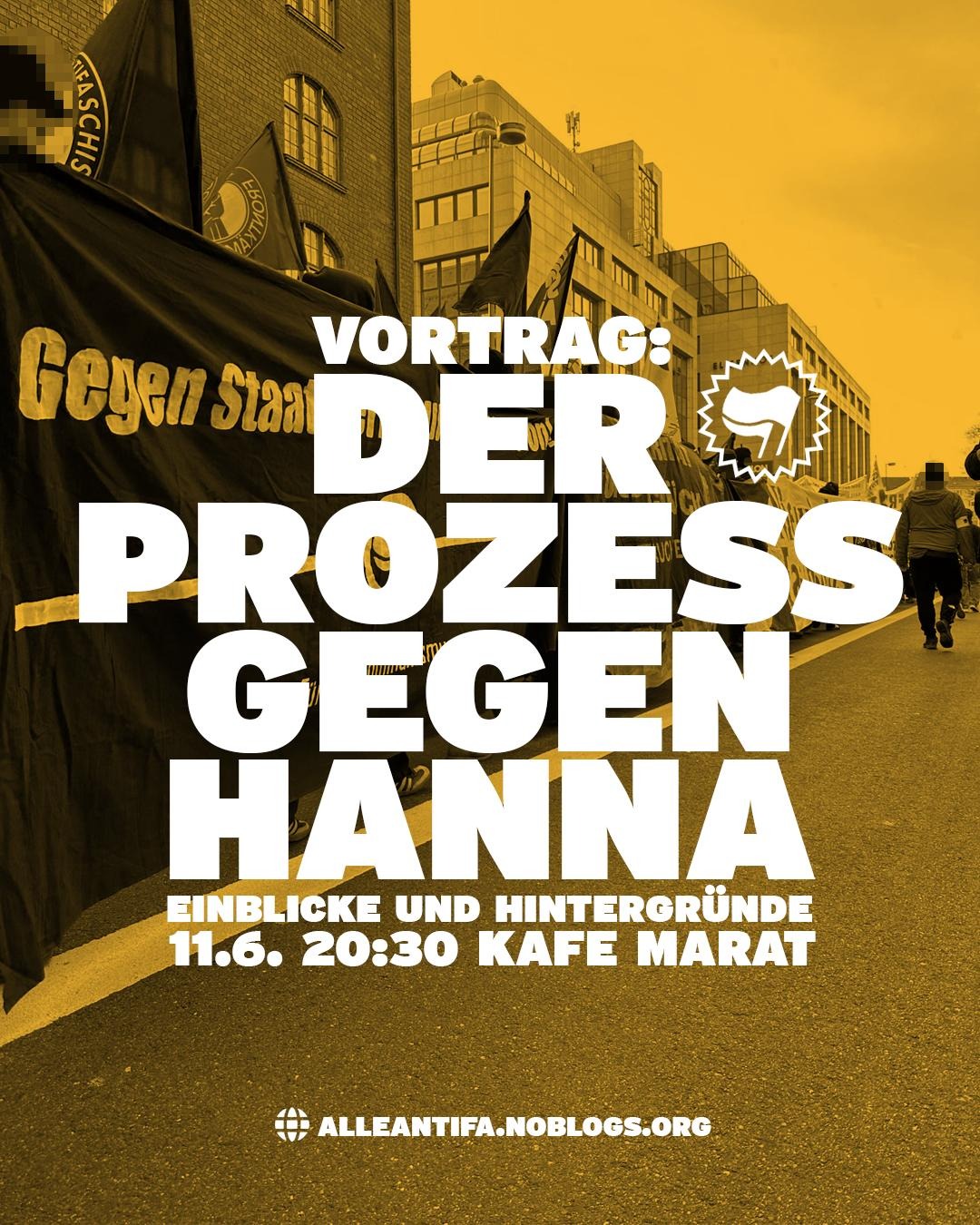 Deshalb wird es am 11.06. um 20:30 Uhr im Kafe Marat einen Vortrag zum derzeitigen Stand im Prozess geben. Neben einer Zusammenfassung des bisherigen Verfahrens wird es um die Methoden gehen, die die Cops zur Verfolgung von Antifaschist*innen anwenden, die Nazis im Gerichtssaal und die mehr als fragwürdigen Narrative der Anklage.